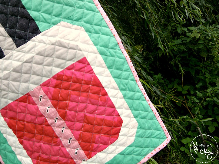 I quilted it using straight lines in two differing widths creating a pattern of varied rectangles and squares. The binding is a Rosali IKEA print, which works great because the polka dots are irregular.