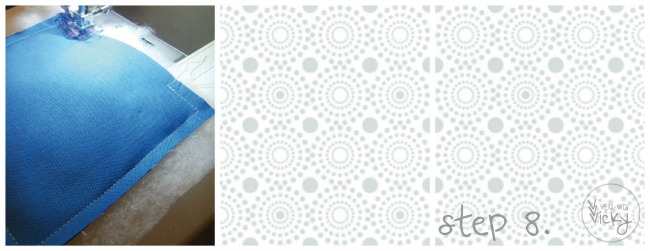 [8] Place the “sandwich” on your sewing machine, start sewing at the edges leaving a 1/4” seam allowance. Leave an opening (important!) Machine tie-off at the start and end of your seam.
