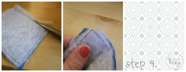 [9] Now cut down the batting directly to the seam, leaving almost no seam allowance. Be careful not to cut into your fabric layers or into the seam. Please use scissors for this, a rotary cutter won’t work. Also trim the fabric corners to make better coaster corners during the next step.