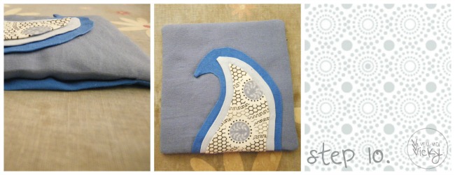 [10] Turn your coaster inside out. Push the corners out neatly using a sharp object like your (closed) scissors. At the remaining opening, turn the edges of the fabric inside about 1/4” and press gently with your fingers. Press the opening closed with your iron and iron over the entire coaster on low temperature. I used polyester batting so this is necessary to make the sandwich a little flatter for quilting. If you use a thin cotton batting, you don’t have to press the coaster as a whole.