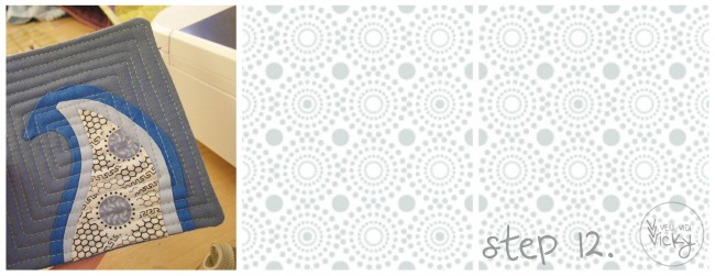 [11] Now start quilting starting from the edge of the coaster. Sew as close to the edge as possible and make sure you sew your opening closed by doing so. Trace your seam to the inside quilting a big square spiral. Instead of letting your machine tie off, bury the threads when you’re done quilting.
