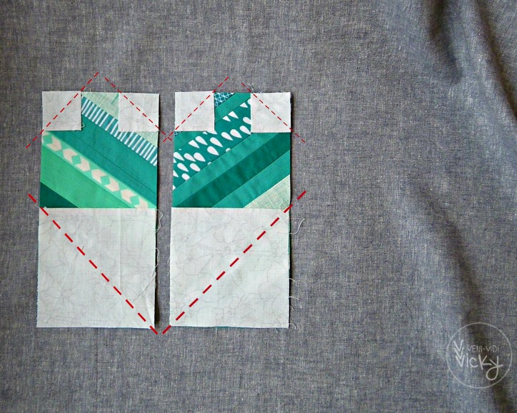 The hearts are supposed to be made of one colour-scheme each and since I have a lot of teal and turquoise fabrics I made my blocks out of those. I did a bit of improv piecing, cut my panels down to rectangle size and sewed the edges off 45° with my background fabric. After adding the border it was done, pretty easy!