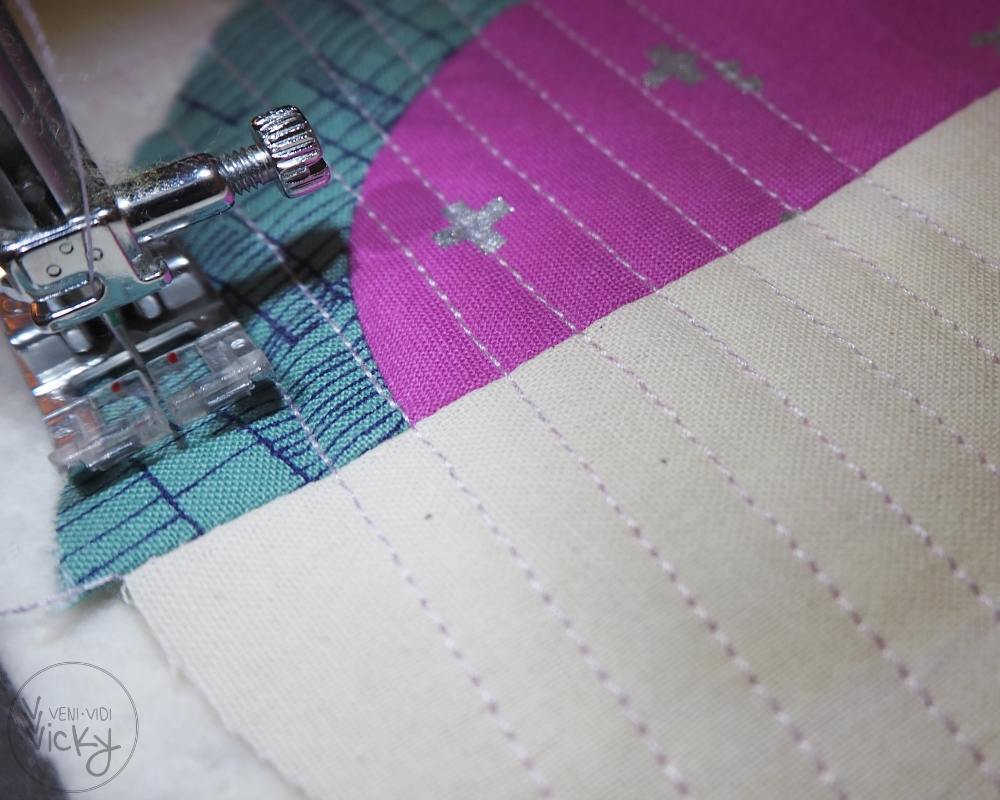 Wenn ihr die Blöcke fertig genäht habt, werden sie gequiltet. Schneidet dazu ein passendes Stück Vlies aus, legt es unter den Block und fangt an abzusteppen. Eine Rückseite oder voriges Pinnen ist hier nicht nötig. Quiltet die Blöcke so wie ihr mögt (Ich bin ein großer Straight-Line-Quilting Fan!)