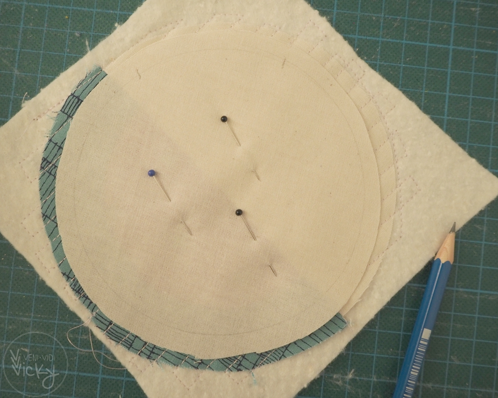 Nun schnappt euch einen Zirkel, oder auch einen passend großen runden Gegenstand (ungefähr 2cm kleiner als der Block im Durchmesser) als Vorlage für die kreisförmige Nessel-Rückseite des Untersetzers. Markiert 1/4″ vom Rand die Nahtlinie. Legt den gequilteten Block und den Kreis auf rechts zusammen und näht entlang der gekennzeichneten Linie. Dabei muss circa ein Fünftel des Kreises “offen” bleiben. Die Naht am Anfang und Ende kurz vernähen.