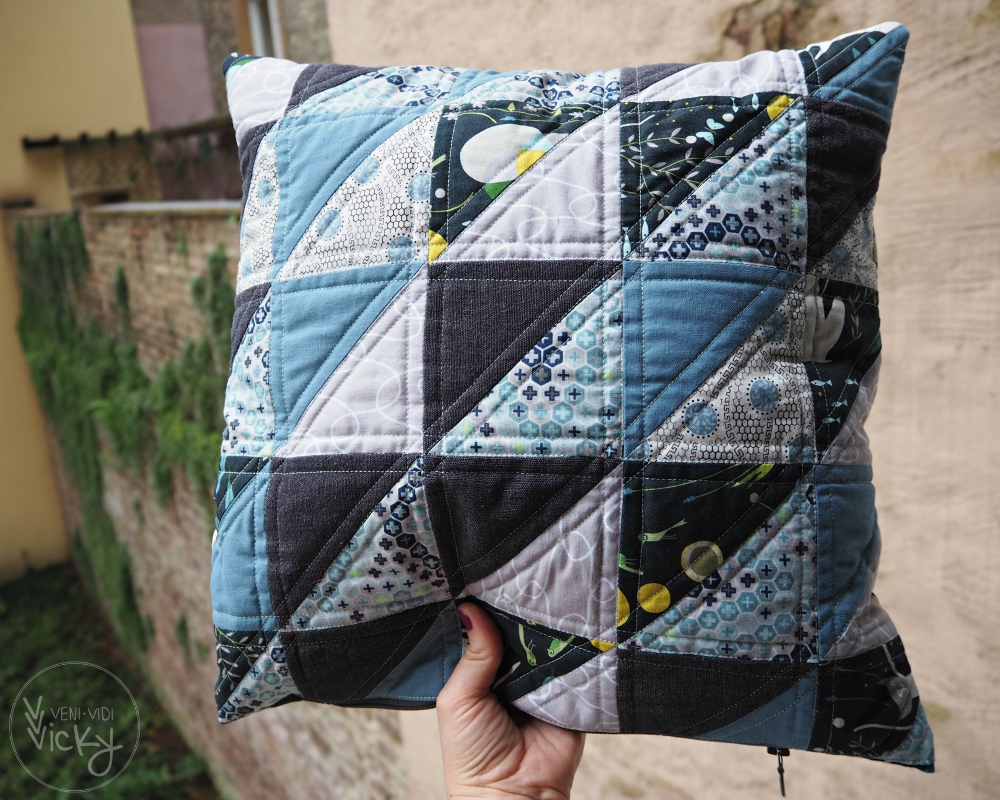 Hi Vicky! what a gorgeus pillow! Beautiful fabrics and I love the hst blocks – my favourites! I think this is very good present for a man. They like to use pillows on the sofa as we do. x Teje